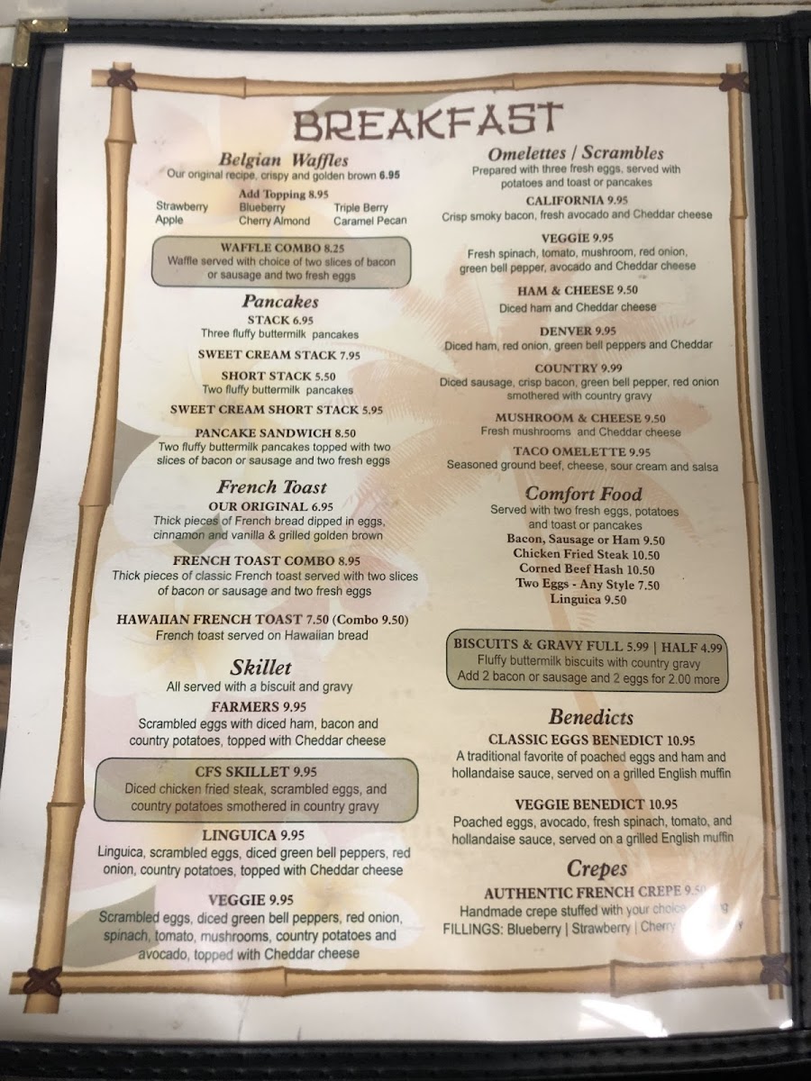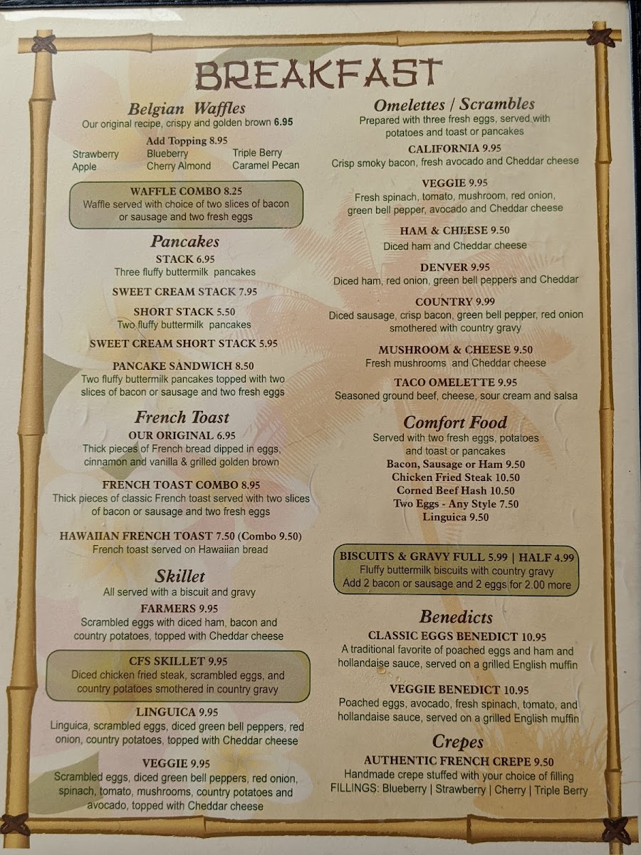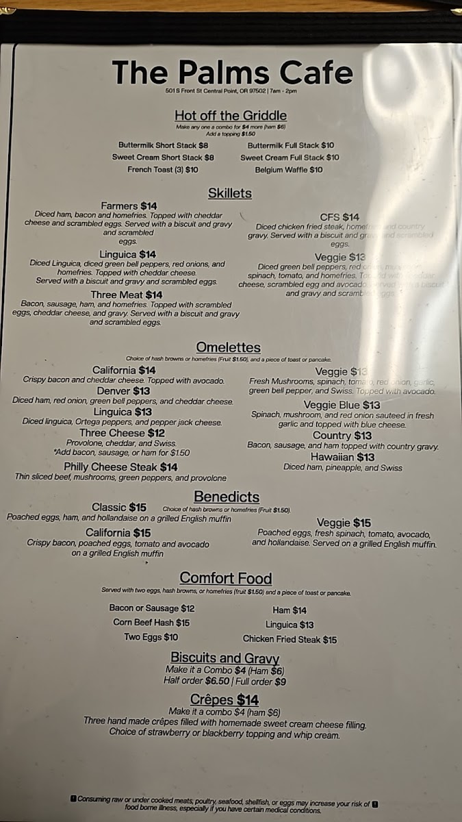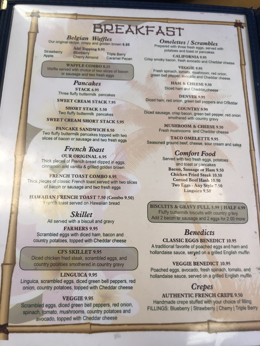 From a reviewer’s perspective, the menu at The Palms Cafe offers a concise yet satisfying breakfast-focused selection that highlights comfort food done right. The breakfast section sets the tone with classics like Belgian Waffles and the Waffle Combo, appealing to both purists and those who want a heartier start to the day. Pancake lovers can choose between the traditional Stack or the richer Sweet Creams Stack, which adds a touch of indulgence without straying from familiar flavors. The French toast options, including Our Original and the French Toast Combo, reinforce the café’s strength in delivering timeless morning staples with consistency and balance. For guests craving something more filling, the skillet choices such as the Farmers Skillet and Cfs Skillet provide a savory, satisfying option that feels substantial and well-suited for a leisurely breakfast or brunch. Rounding out the menu, the omelette and scramble selections like the California and Veggie cater to those looking for egg-based dishes with fresh, lighter profiles. Overall, the menu may not be extensive, but it is thoughtfully curated, focusing on popular breakfast favorites that reflect a dependable, down-to-earth dining experience-making it a fitting conclusion to a comforting meal at The Palms Cafe.